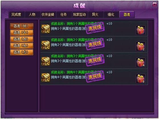 5. 成就系统新增器魂成就分类,投放了5个器魂成就,满足该条件的玩家需要卸下对应的器魂,再重新封魂才可激活该成就
