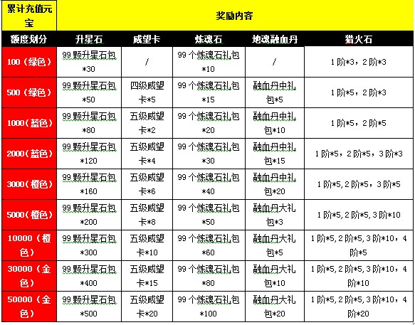 活动期间每天累计充值达到50000元宝,第2天即可获得包括“累计充值50000礼包”