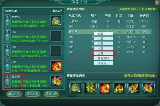 当帮会官员报名帮战时,弹出“仙尊斗炼”布阵界面,由报名官员安排帮会成员为“五行仙尊”争夺对应五行位。五行位争夺成功可以使帮会成员在正式的帮会战中得到相应的属性提升,每次帮战,五行位对应的属性提升效果随机出现,可以根据需要安排帮会成员。(见下图)