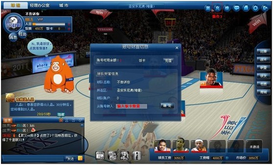 4、当玩家在完成充值后,进入游戏会立刻看到一个提示充值成功的窗口,窗口里的提示内容会指引玩家完成剩下的操作。玩家点击游戏里右上角的充字会弹出一个操作面板(操作3);然后在弹出的对话框中输入所需要转入的饭卡数量,点击确认即可。